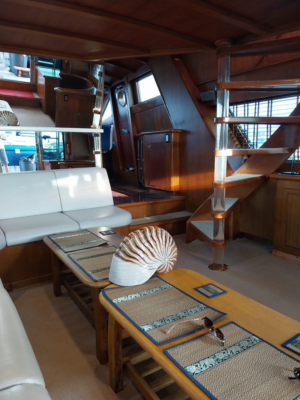 Открытая верхняя палуба с диванами,столом, раковиной, холодильником